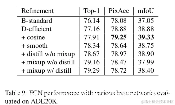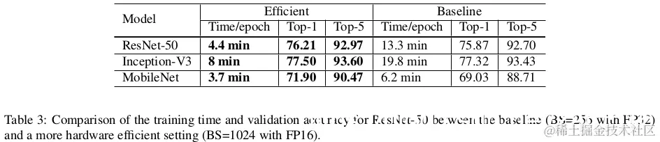 那么这二者的优化效果如何?Table3是采用更大的batch size和16位浮点型进行训练的结果,可以看出和原来的baseline相比训练速度提升还是比较明显的,效果上也有一定提升,尤其是MobileNet。