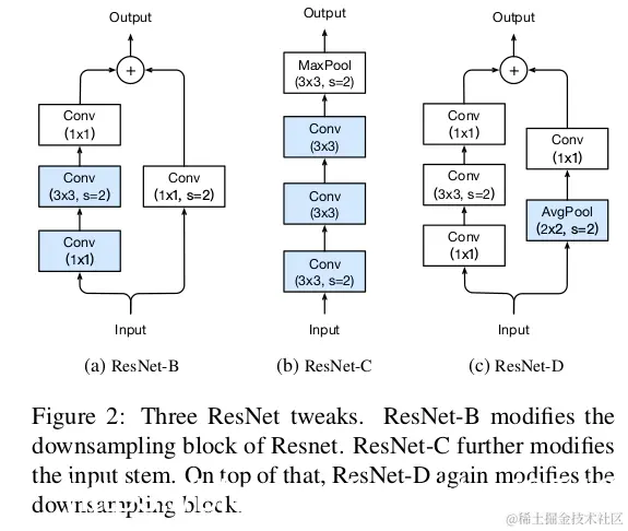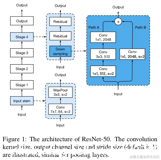 这部分的优化是以ResNet为例的,Figure1是ResNet网络的结构示意图,简单而言是一个input stem结构、4个stage和1个output部分,input stem和每个stage的内容在第二列展示,每个residual block的结构在第三列展示,整体而言这个图画得非常清晰了。