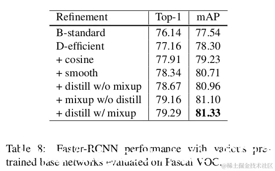 最后作者也证明了在分类算法中的这些优化点在其他图像任务中同样有效,比如目标检测任务,如Table8所示,可以看出在ImageNet数据集上表现最好的图像分类算法同样在VOC数据集上有最后的表现。