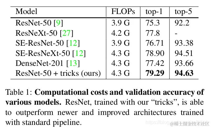 首先可以先来看看作者训练的ResNet50网络的效果。在Table1中对比了目前几个常用分类网络的效果,最后一行是作者通过添加各种训练技巧后复现的ResNet-50效果,和原论文的结果对比提升非常明显(top-1准确率从75.3提升到79.29)。
