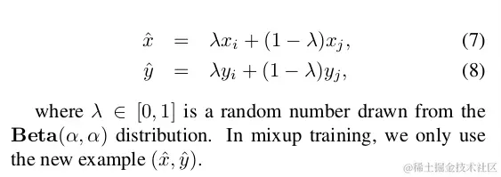 4、引入mixup,mixup其实也是一种数据增强方式,假如采用mixup训练方式,那么每次读取2张输入图像,假设用(xi,yi)和(xj,yj)表示,那么通过下面这两个式子就可以合成得到一张新的图像(x,y),然后用这张新图像进行训练,需要注意的是采用这种方式训练模型时要训更多epoch。式子中的λ是一个超参数,用来调节合成的比重,取值范围是[0,1]。