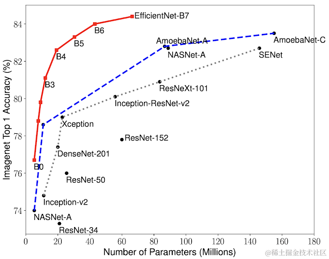 EfficientNet 在 ImageNet 上的性能。