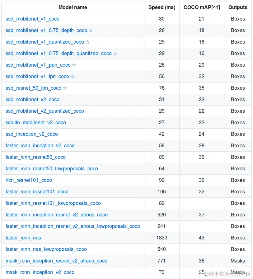 TensorFlow Object Detection API提供了多种目标检测的网络结构预训练的权重,全部是用COCO数据集进行训练,各个模型的精度和计算所需时间如下: