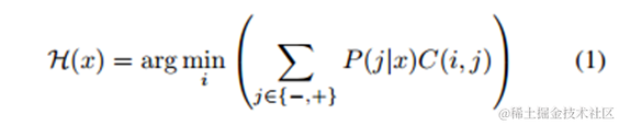 - 从贝叶斯风险理论出发,把代价敏感学习看成是分类结果的一种后处理,按照传统方法学习到一个模型,以实现损失最小为目标对结果进行调整,优化公式如下所示。此方法的优点在于它可以不依赖所用具体的分类器,但是缺点也很明显它要求分类器输出值为概率。