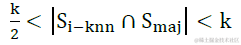 在Borderline-SMOTE中,若少数类样本的每个样本xixi求k近邻,记作Si−knnSi−knn,且Si−knnSi−knn属于整个样本集合SS而不再是少数类样本,若满足