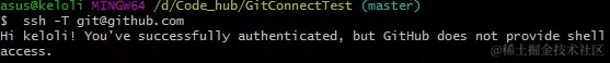 New SSH key,输入公钥保存。SSH key 添加成功之后,输入ssh -T git@github.com进行测试,如果出现以下提示证明添加成功了。本机与github连接成功示意图