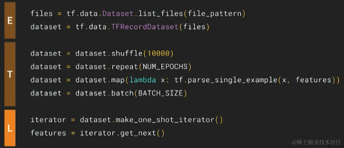 分别是从数据源头处读取数据(Extract)(比如内存,磁盘,远程服务器,云端)、对数据做一系列的变换(Transform)、载入CPU或者GPU(Load)等等,下面是一个例子,ETL分别代表这三个步骤: