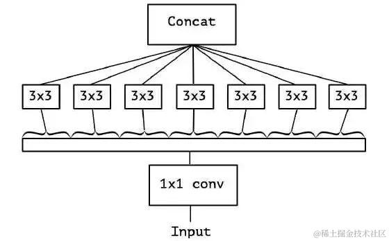 Xception 模型挑战了这个思维定势,它让每个卷积核只负责输入的某一个通道,这就是所谓的 Depth-wise Separable Convolution。