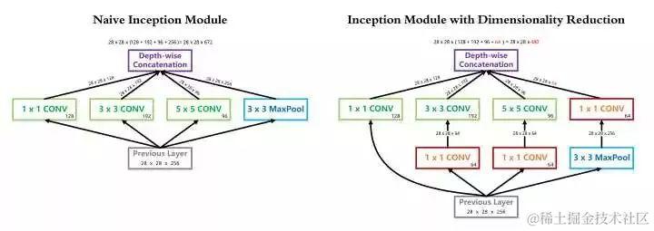 InceptionV1 借鉴了 Network in Network 的思想,在一个 Inception Module 中构造了四个并行的不同尺寸的卷积/池化模块(上图左),有效的提升了网络的宽度。但是这么做也造成了网络的时间和空间复杂度的激增。对策就是添加 1 x 1 卷积(上图右红色模块)将输入通道数先降到一个较低的值,再进行真正的卷积。