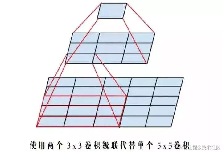 根据上面提到的二维卷积输入输出尺寸关系公式,可知:对于同一个输入尺寸,单个 5×5 卷积的输出与两个 3×3 卷积级联输出的尺寸完全一样,即感受野相同。