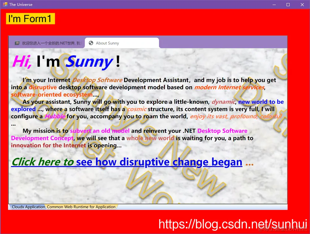 <strong style="font-size:32px; color:black">欢迎<i style="color:fuchsia">您来到</i><i style="color:blue">FirstApp的 </i><b style="color:coral">.NET桌面软件生态世界</b>!</strong>