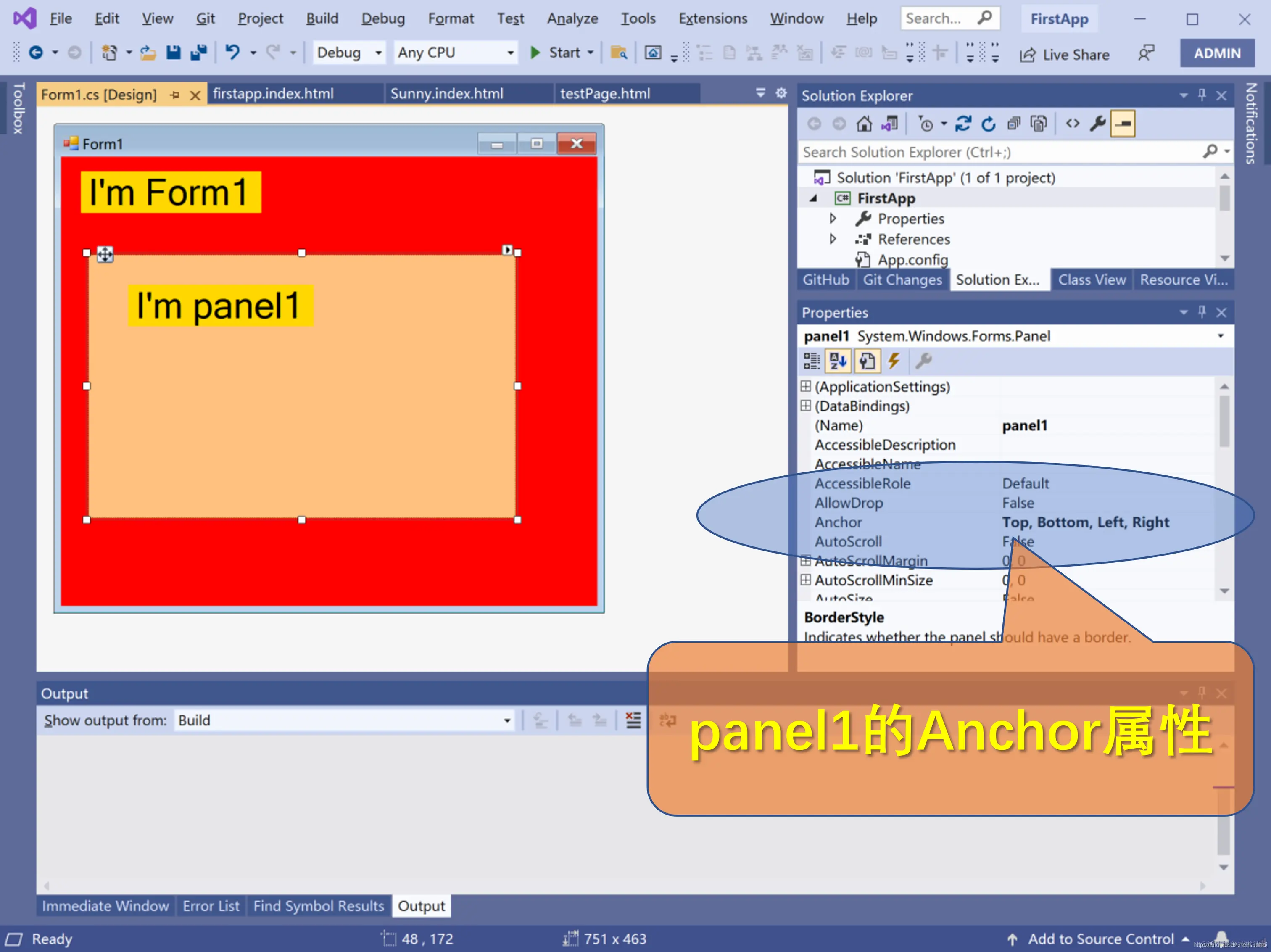 我们打开FirstApp这个工程,在Form1上面增加一个panel控件,同时设置panel1的“Anchor”属性: