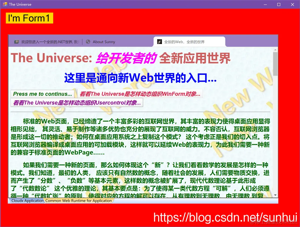 第一个Web页面表达了这样的设想:一旦Exe做为入口确定下来,那么那些符合规范的.NET GUI对象,都应该是Web页面驱动的元素,如果一个应用系统内置了浏览器,那么就意味着,开发者可以通过大量的写Web页面,营造出表现力极为丰富的”应用内容“空间,特别,这些Web页面可以成为一个Form窗体(更一般的情况:Win32窗体)的一部分,进而形成了一种通用集成的态势,原则上,符合.NET开发规范的那些控件,几乎都可以按照如上的页面结构,成为你GUI对象的一部分,我们后续会逐步展开这些细节。