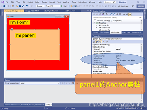 从现在起,希望可以开启一个全新的、既熟悉又陌生的C#之旅。首先,您需要准备好一个C# WinForms工程(当然,您可以创建一个新工程)。参照我们的 “一分钟视频教程”,您可以很快完成我们需要的调整。做为示范,我们创建了一个最基本的C#工程FirstApp,只不过我们对Form1对象增加了一个label以及一个panel对象如图所示: