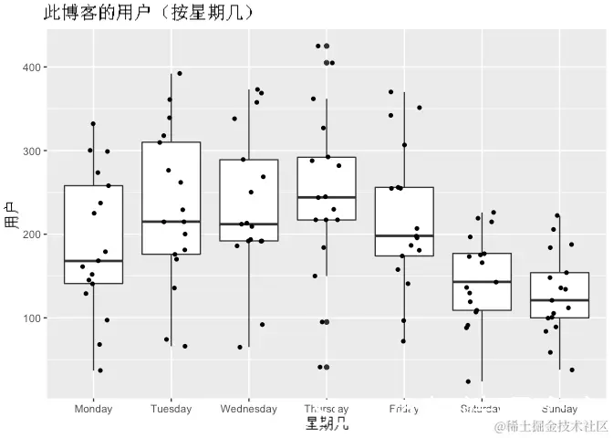 用这个博客的每日用户数据看上面的图表,用户似乎随着时间的推移而增加。该序列从不到 100 名用户开始,在一天内在给定的时间点增加到 400 多名用户。用户似乎普遍存在上升 趋势 。我们还可以粗略地识别出系列中的波峰和波谷,或起伏。这种模式可能与 季节性变化有关。换句话说,每天访问此博客的用户数量似乎存在一定程度的季节性。我们可以按星期几运行一个简单的箱线图,尝试更好地可视化这种模式: