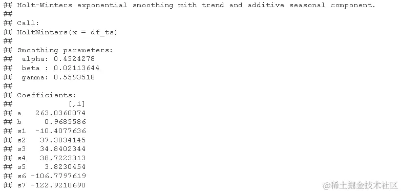 从上面的结果中,我们可以看到 alpha 的平滑估计值为 0.4524278,beta 为 0.0211364,gamma 为 0.5593518。alpha 的值大约为 0.5,这表明短期的、近期的观察和历史的、更远的观察都在时间序列的趋势估计中起作用。beta 值接近于零,这表明趋势分量的斜率(从一个时间段到下一个时间段的水平变化)在整个序列中保持相对相似。gamma 的值与 alpha 相对相似,这表明季节性估计基于近期和远距离观测。