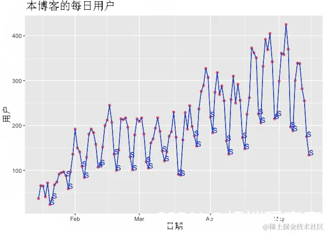时间序列分析中最重要的步骤之一是绘制数据并检查它是否有序列中的任何模式和波动。让我们在时间序列图中绘制我们日常用户的结果,以检查趋势或季节性,周末用S符号标识: