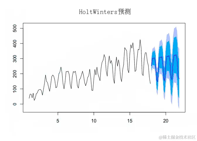 从上面的模型拟合中可以看出,Holt-Winters 的平滑是使用三个参数完成的: alpha、 beta 和 gamma。Alpha 估计趋势(或水平)分量,β 估计趋势分量的斜率,而 gamma 估计季节性分量。这些估计值基于系列中的最新时间点,这些值将用于预测。alpha、beta 和 gamma 的值范围从 0 到 1,其中接近 0 的值表示最近的观测值在估计中的权重很小。