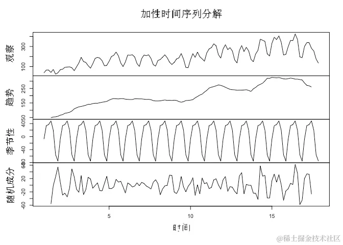 简单地说,加法分解用于时间序列,其中序列的基础水平波动但季节性的幅度保持相对稳定。随着趋势水平随时间变化,季节性和不规则成分的幅度不会发生显着变化。