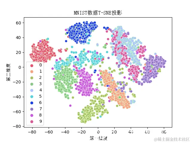 该图显示了 MNIST 数据的二维可视化。颜色定义了目标数字及其在 2D 空间中的特征数据位置。