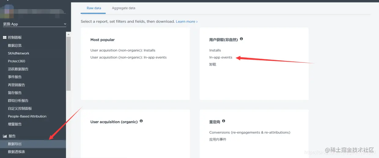 测试完成后 选择 报告 -> 数据导出 -> 用户获取 -> In-app events
