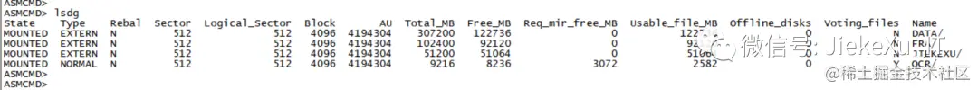 State Type Rebal Sector Logical_Sector Block AU Total_MB Free_MB Req_mir_free_MB Usable_file_MB Offline_disks Voting_files Name