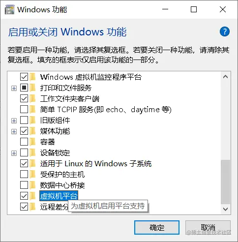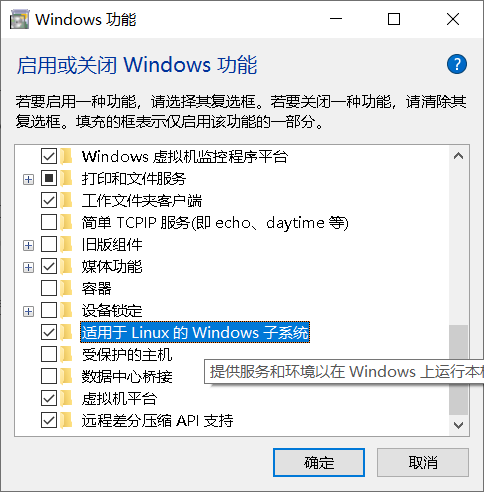 打开设置 - 应用和功能,右上角位置程序和功能 - 启用或关闭Windows功能 - 勾选适用于Linux的Windows子系统和虚拟机平台,如下图所示