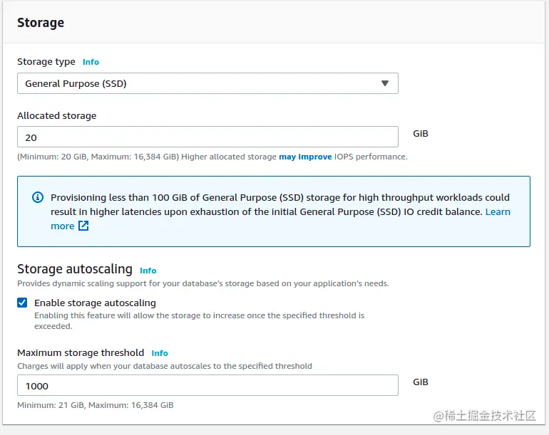 当你设置AWS SQL Server部署时,确保选择存储自动扩展选项。这是为了在数据需求较高的情况下自动扩展数据库。AWS将只收取20GB的费用,直到你的存储需求超过这个数字。确保从成本角度来看,最大的存储阈值对你来说是一个舒适的值,如下图所示。