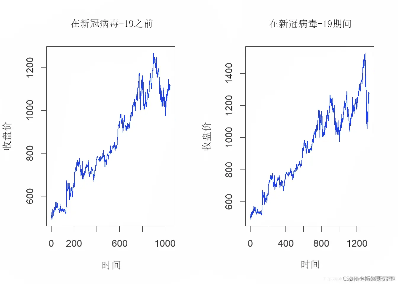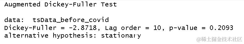 - 对于COVID-19之前的数据集,ADF检验给出的p值为 0.2093,该值大于0.05,因此说明时间序列数据 不是平稳的。