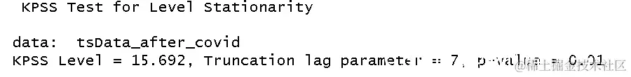 - 对于COVID-19之后的数据集,KPSS检验给出的p值为 0.01,该值小于0.05,这说明时间序列数据 不是平稳的。