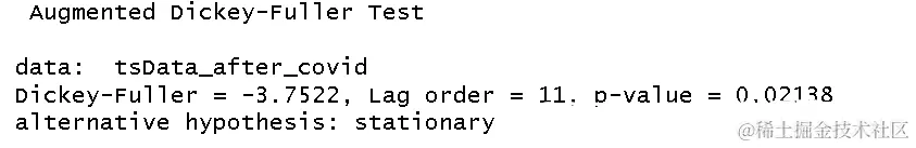 - 对于COVID-19之后的数据集,ADF检验给出的p值为0.01974,该值 小于0.05,这说明时间序列数据是 平稳的。