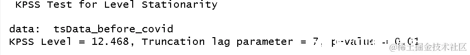 - 对于COVID-19之前的数据集,KPSS检验得出的p值为 0.01,该值小于0.05,因此说明时间序列数据 不是平稳的。