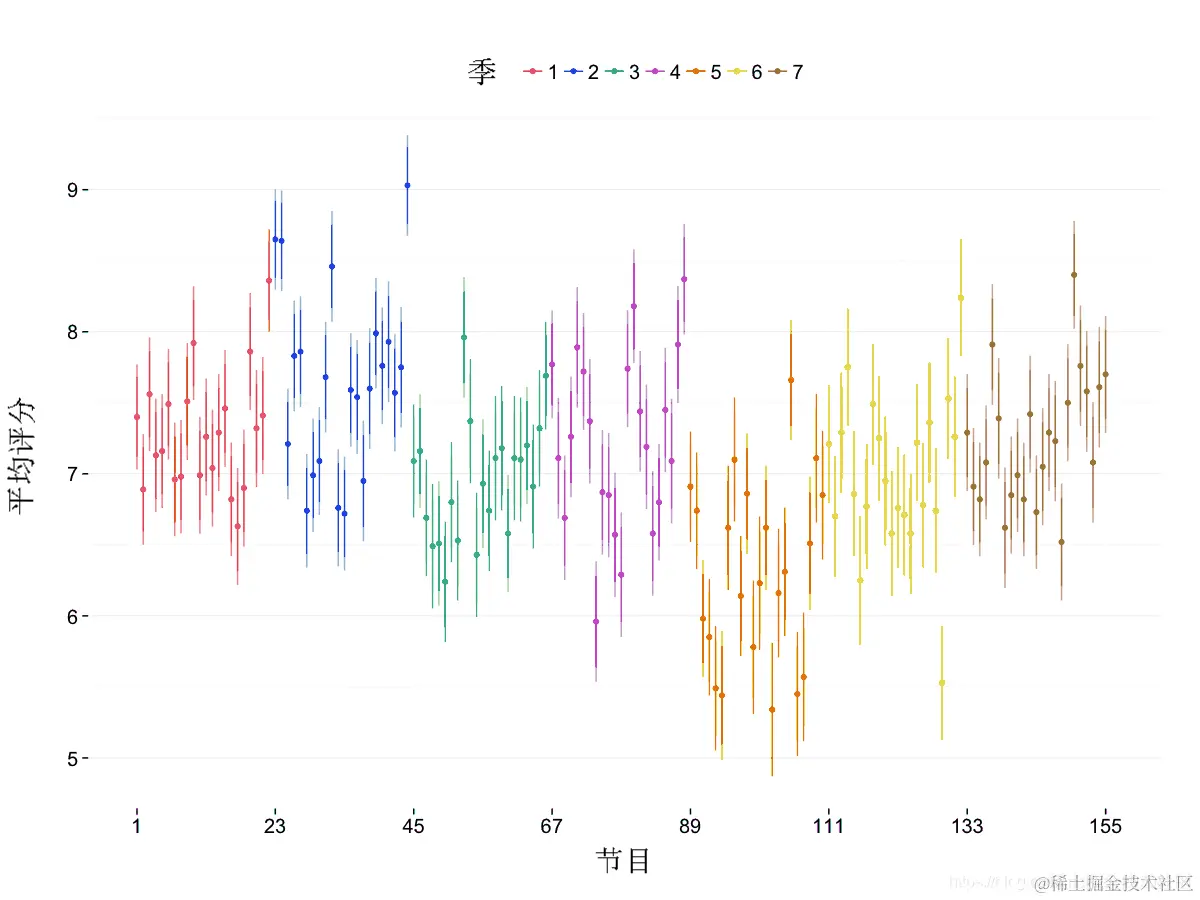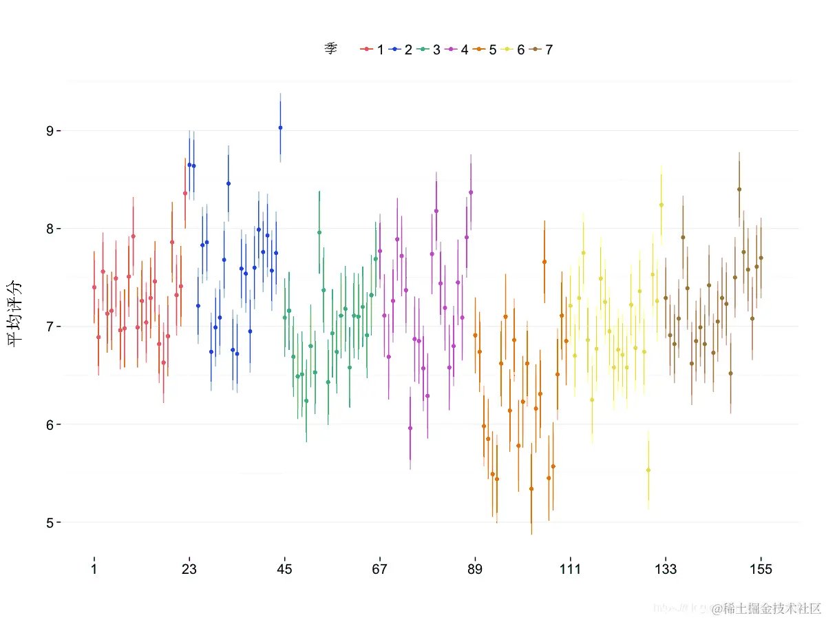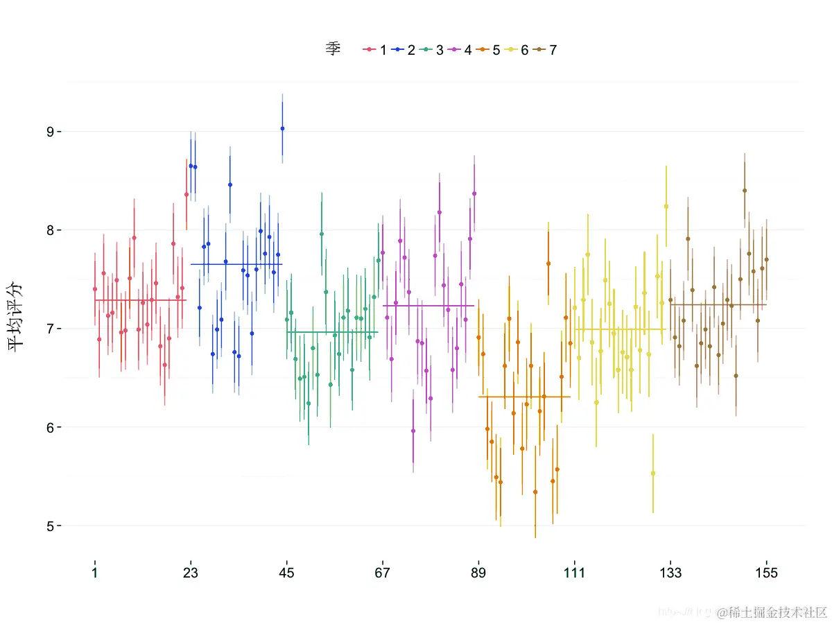 该图对于每个季节的平均收视率会更有用,这些收视率很容易用该ddply() 函数检索 。还计算了最小和最大集数,以便能够绘制每个季节的水平段。由于我们将之前的绘图保存为 ggplot2 对象,因此添加线条只需要对额外的图形元素进行编码并将其添加到保存的元素之上。