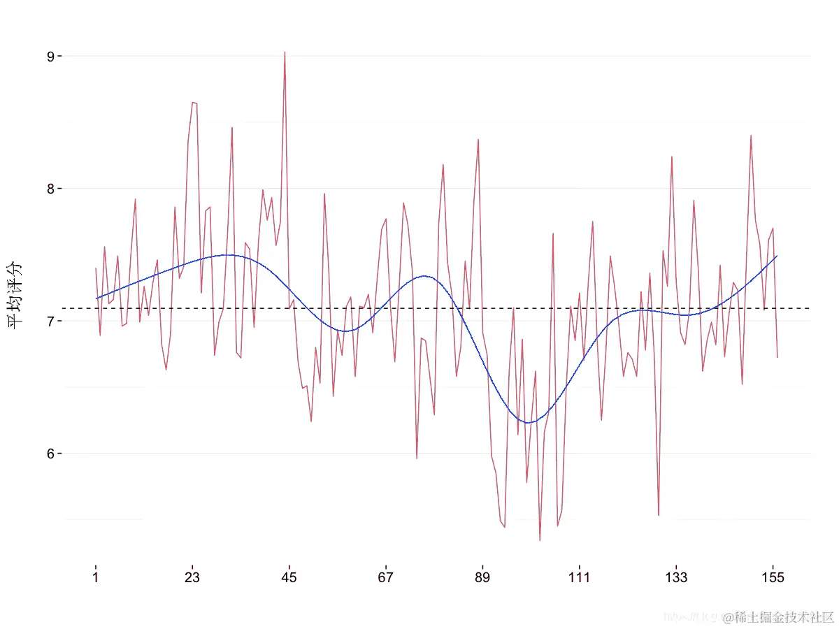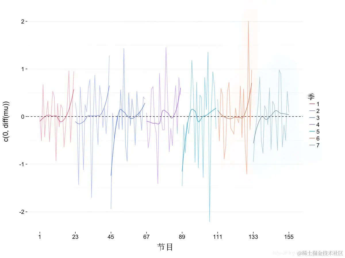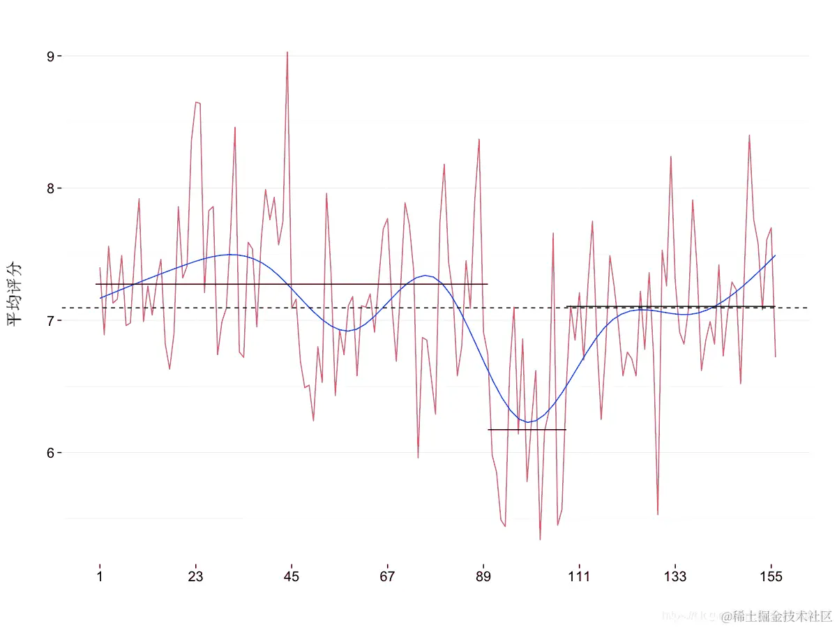 该图对于每个季节的平均收视率会更有用,这些收视率很容易用该ddply() 函数检索 。还计算了最小和最大集数,以便能够绘制每个季节的水平段。由于我们将之前的绘图保存为 ggplot2 对象,因此添加线条只需要对额外的图形元素进行编码并将其添加到保存的元素之上。