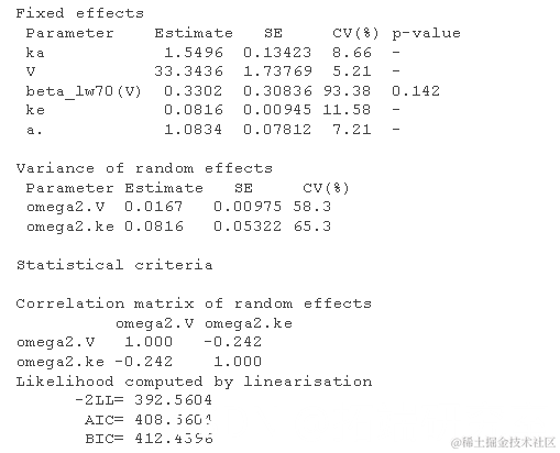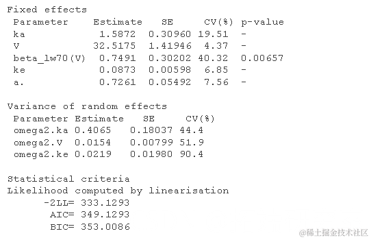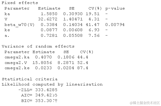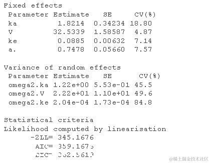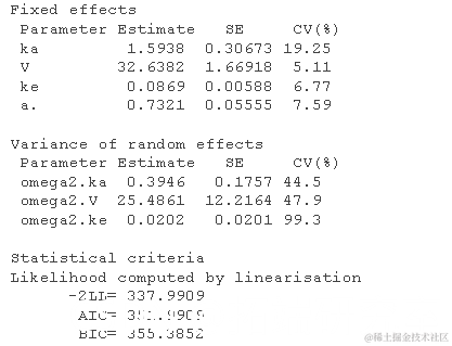 然后可以通过观察到的 FIM 的逆来估计 θ^ 的方差-协方差矩阵。θ^ 的每个分量的标准误差 (se) 是标准偏差,即方差-协方差矩阵的对角元素的平方根。