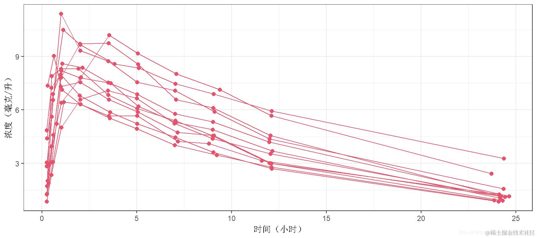 茶碱数据文件报告来自抗哮喘药物茶碱动力学研究的数据。给 12 名受试者口服茶碱,然后在接下来的 25 小时内在 11 个时间点测量血清浓度。