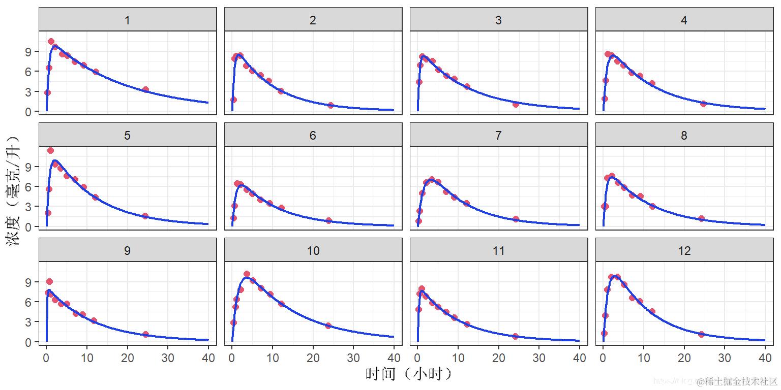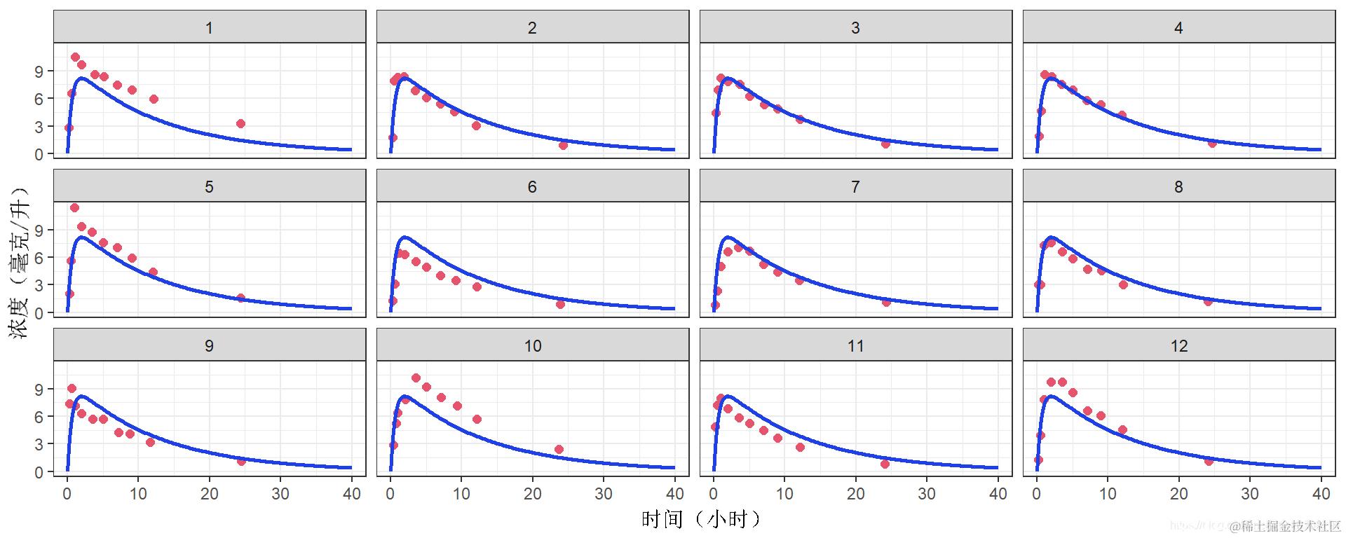 每个个体预测浓度 f(t,ψ^i)似乎很好地预测了 12 个受试者的观察浓度:
