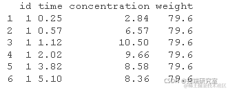 此处,时间是从抽取样品时开始给药的时间(h),浓度是测得的茶碱浓度(mg/L),体重是受试者的体重(kg)。