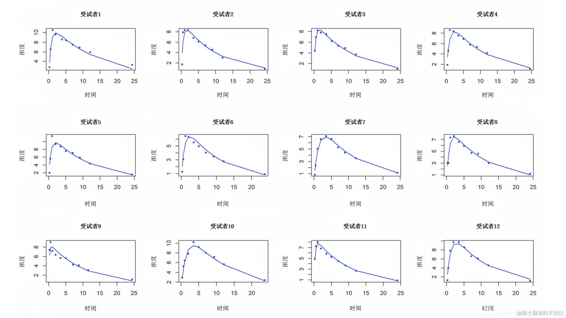 这12个人的模式是相似的:浓度首先在吸收阶段增加,然后在消除阶段减少。然而,我们清楚地看到这些曲线之间的一些差异,这不仅仅是由于残差造成的。我们看到病人吸收和消除药物的速度或多或少。