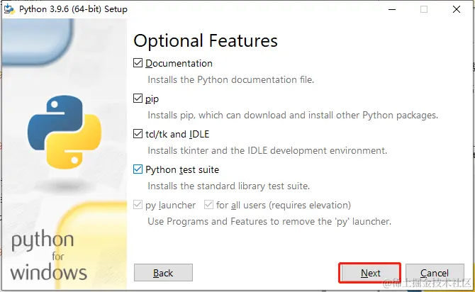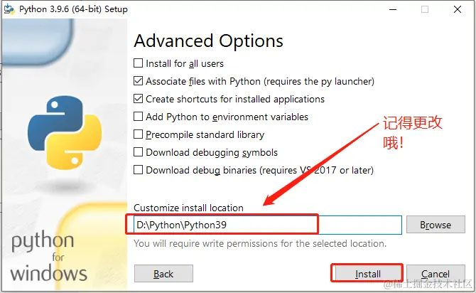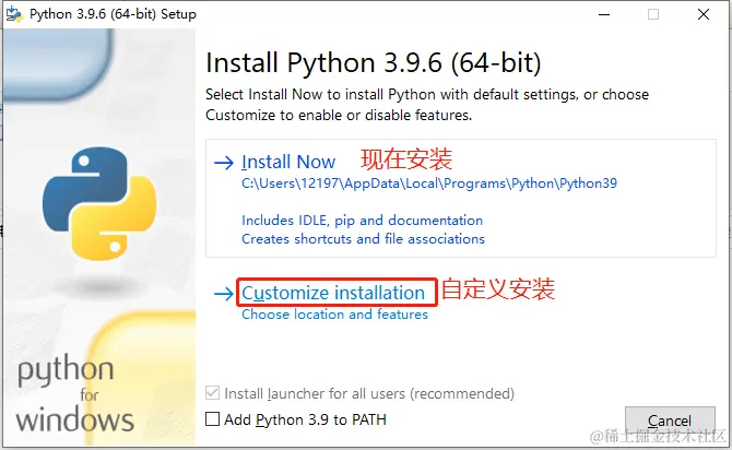 第一个代表默认安装,第二个是自定义安装。默认安装的好处就是快,但是我们可以发现,他的安装路径是 C 盘,也就是我们常说的系统盘,如果我们什么都安装在 C 盘,你的电脑会越用越卡,显然,不是我们想要的,这里,我们选择第二个,自定义安装(即 Customize installation)。点击好后,依次如下图所示