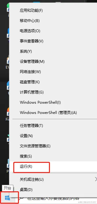 如果你的 Win+R 按了没有效果,可以试试在开始处右击,点击运行,同样也可以出现,如下图所示