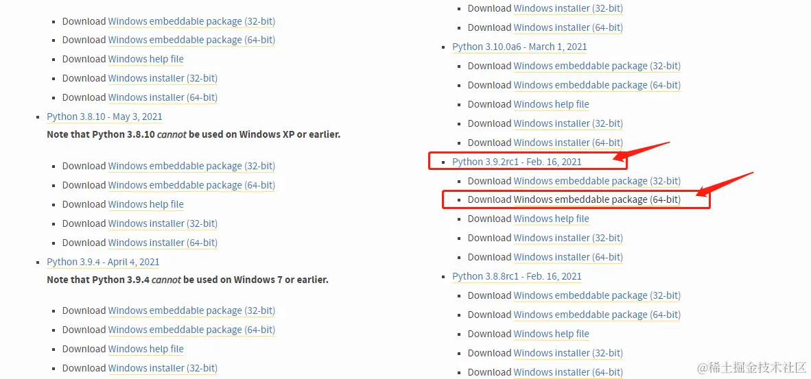 可以看出,我的电脑是 64 位的操作系统,则对应下载 64 位的 Python 解释器即可。我这里需要下载 Python3.9 的版本,则选择 Python3.9 的版本,64 位的即可。如下图所示
