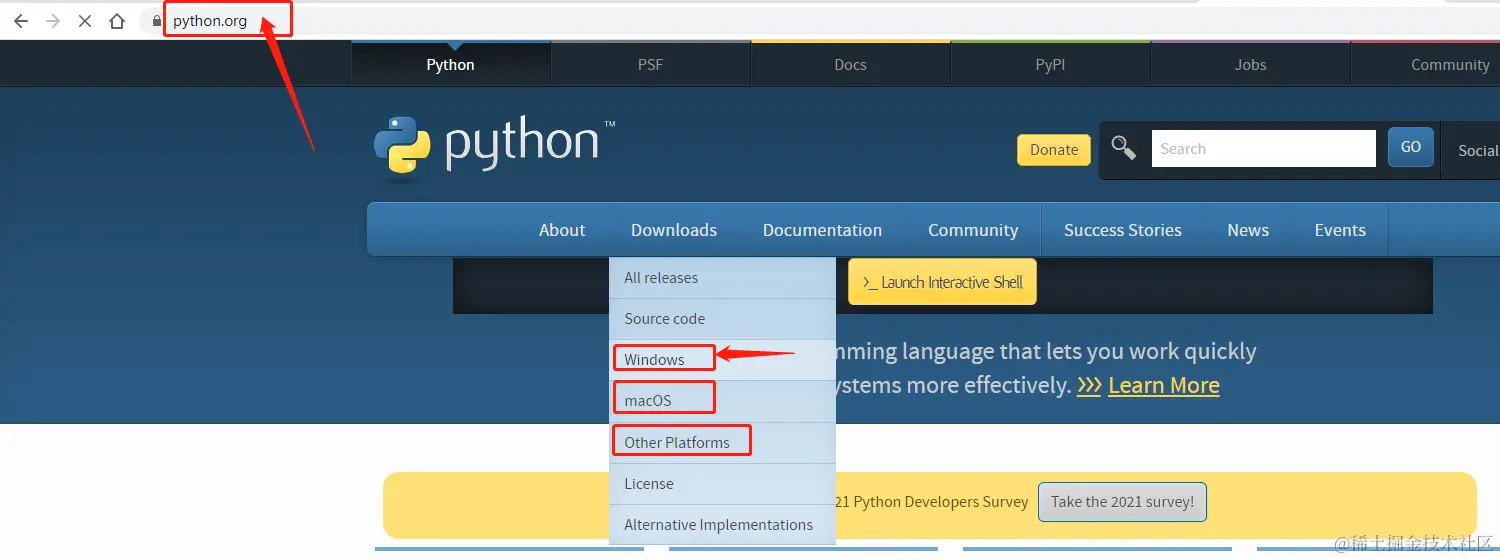 打开 Python 的官网(www.python.org/),找到 Downloads,选择合适的系统版本,如,我是 Windows 系统,就选择 Windows。如下图所示