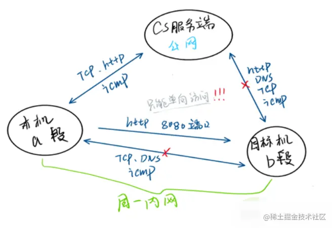 - Tcp、icmp、DNS协议不通,无法直接与公网的cs服务端建立连接,(内网的cs服务端也无法与其建立连接)公网也无法访问目标web服务(纯内网web服务)