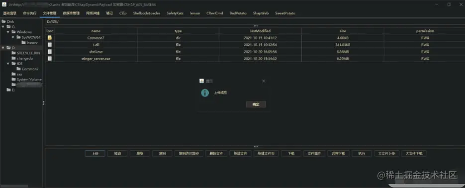 这个地方冰蝎、大马都传文件传不上去,只能用哥斯拉的大文件上传把abptts.aspx传了上去(后面exe的上传也是用的哥斯拉的大文件上传功能)exe文件落地也是个坑,在正常环境中,我们可以用certutil、powershell等方法下载exe到目标上,但是这台机器他不出网,因为出站规则的原因,甚至都无法访问内网中其他机器的web服务器,最后用哥斯拉的大文件上传解决了这个问题。