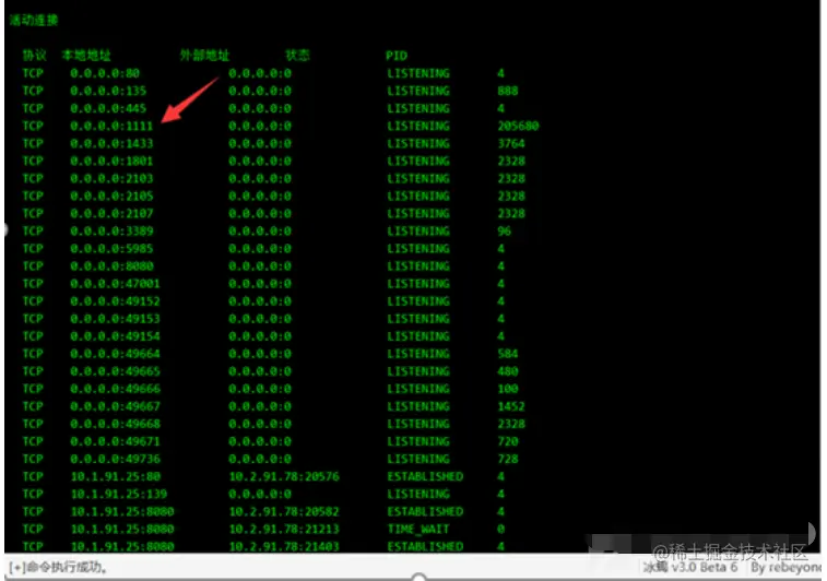 上传正向bind,在冰蝎上执行 D:/beacon_se.exe,可以看到木马在目标机上开启了1111端口,我们通过http隧道去连接这个位于目标机1111端口上的正向bind。