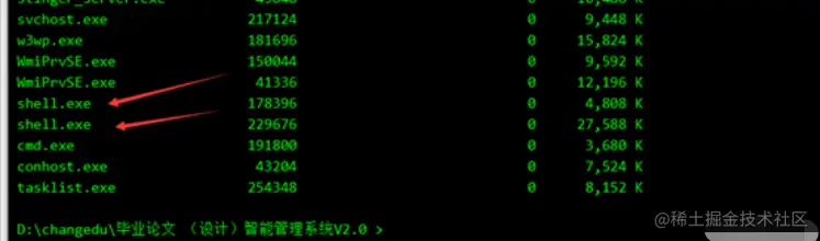 6.免杀处理一下resever_bind,上传至目标并执行不上线,执行一下tasklist发现shell.exe已经执行了,就是不上线,pystinger报错。
