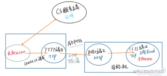 Cs服务端(公网)--> 跳板机(父baecon)--> 7777端口--> 目标8080端口(http隧道)--> 目标1111端口(子baecon)