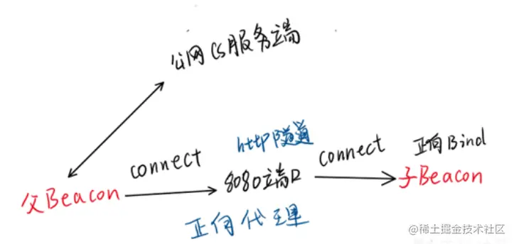 正向shell的作用原理是,bind在目标机器上开放一个监听端口,等待其他主机来访问这个监听端口,子Beacon从父Beacon接受请求,而不是直接与cs服务端通讯。